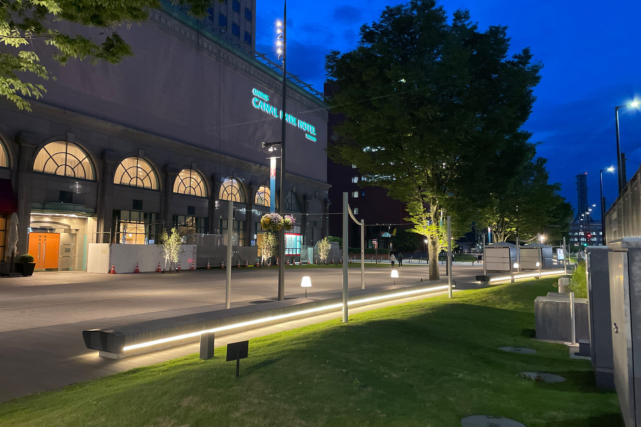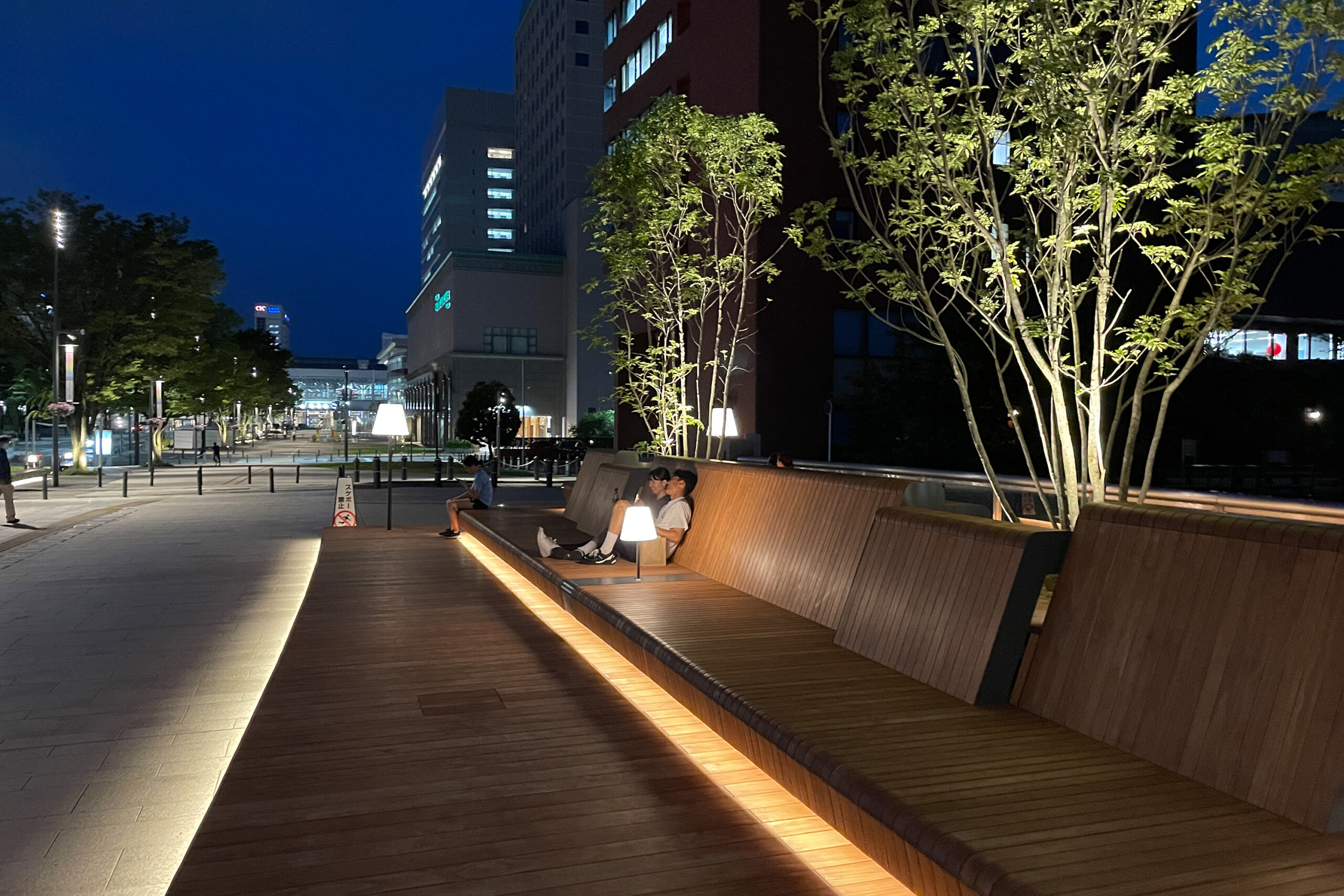 多くの地方都市では新幹線駅周辺は閑散としていて、歩いている人の姿もまばらで寂しさを覚えることが多い。しかし富山では、ウォーカブルなコンパクトシティが実現しており、LRTが通り抜ける駅空間は、降り立った瞬間にワクワクする場となっている。今回のブールバール広場は、富山駅北側の再整備によって生まれた、駅から環水公園へと連続する歩道空間の一部である。実際に歩いている人がとても多く、居場所を柔らかく照らす照明計画も心地よく美しい。