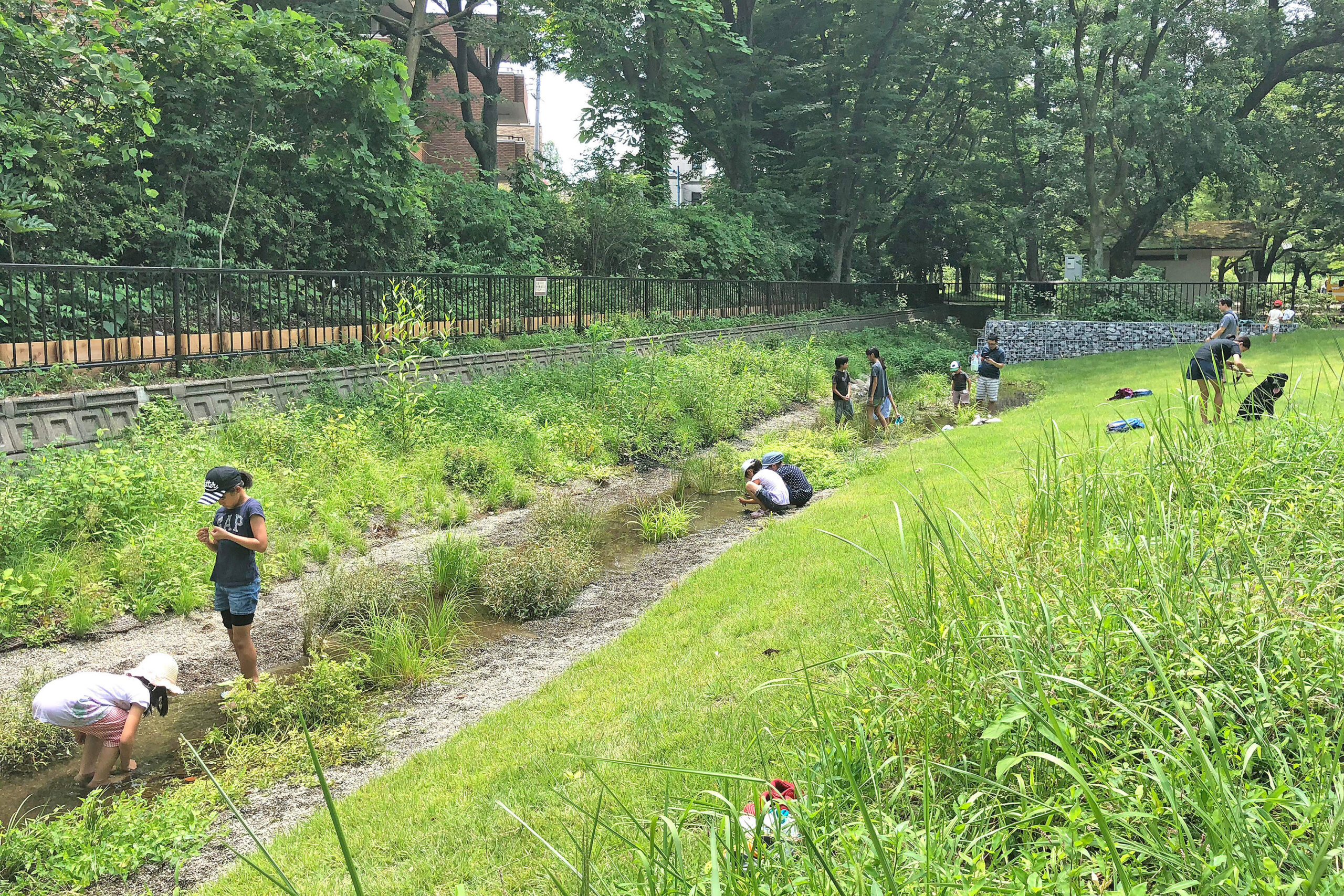 小学生と市民が主体的な活動を10年以上に渡り継続し、市街地の公園内に小川の自然環境を再生してきた取り組みである。整備前は高い金網で隔離された狭い水路だったが、片側の護岸を取り払って拡幅し、人が訪れる公園園地と一体化させ、水面まで遮る人工物がない柔らかな水辺を創出している。水や河床に触れる遊び、園路から川辺を眺める散策の異なる楽しみを想定し、区間を分けた計画の工夫も見られる。現地に掲示された生きものや活動の情報が多く、この場所への愛情を感じさせる。水際の編柵など市民の手づくり整備も多いという。自然と人との失われた関係を取り戻すために積み重ねられている活動こそは賞賛に値する。