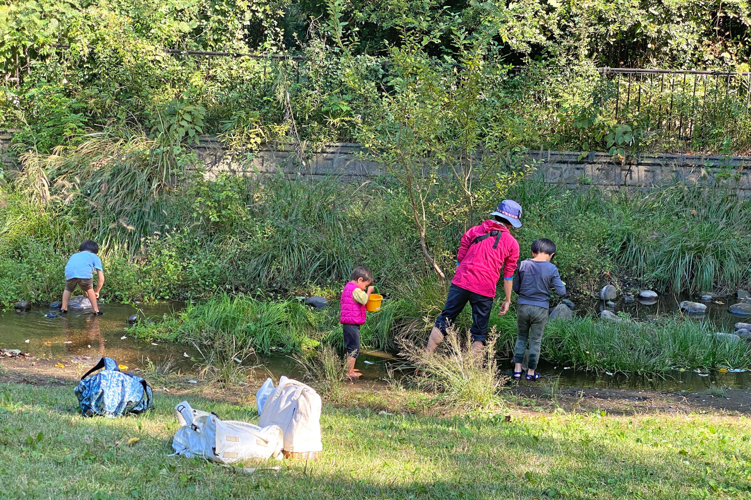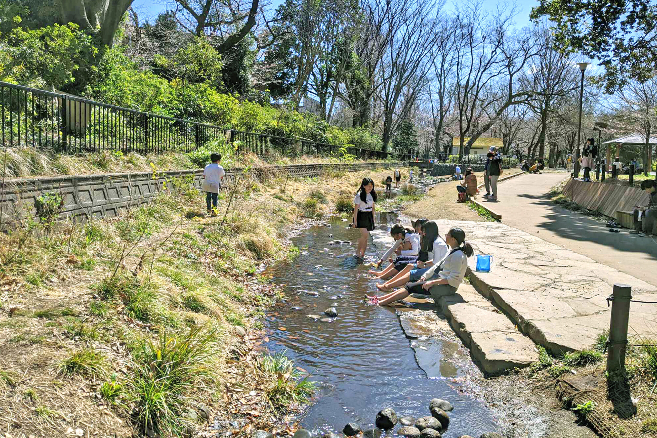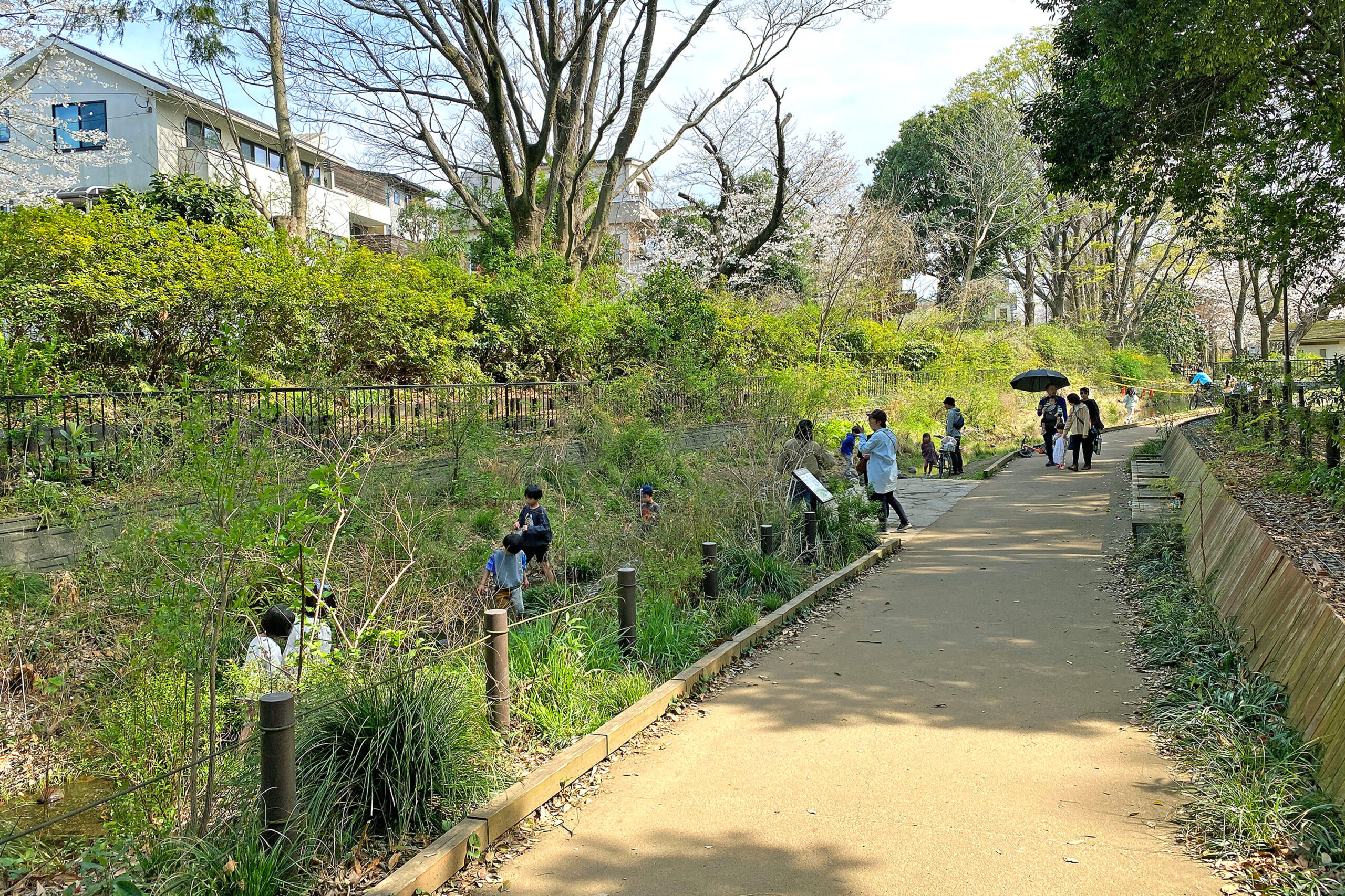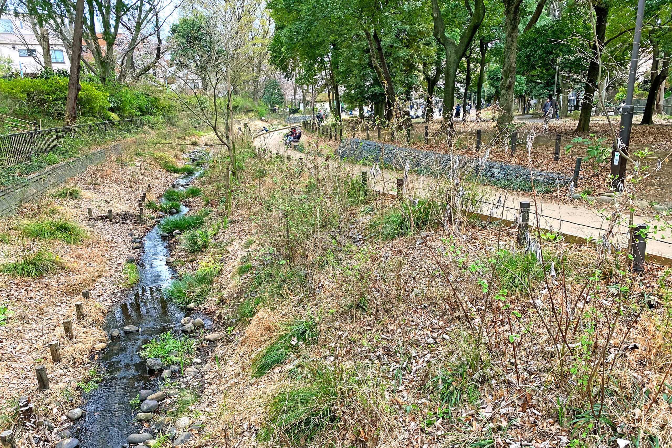 上池の水質が悪く水遊びに適していないため地下水のくみ上げとし、上池からの越流水はバイパス管で水路に流入させない形にした。東京都の協力によって都立公園敷地の一部を水路と一体的に整備することができた。下流の草地広場、中間の親水テラス、上流生物保護区間の展望テラスと場所に応じた水辺を配置。流路の屈曲、水深や流速の変化など自然の川の形状を組み込んでいる。