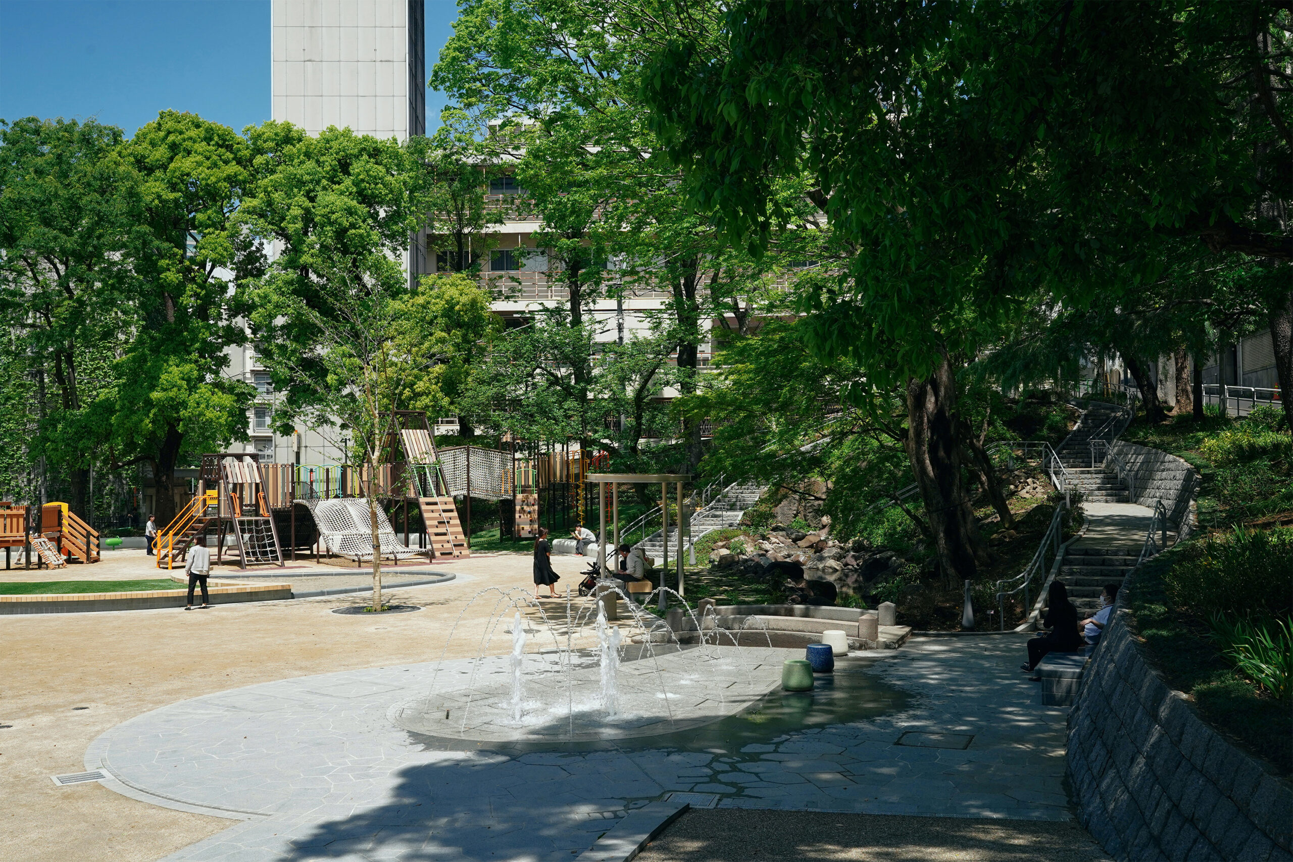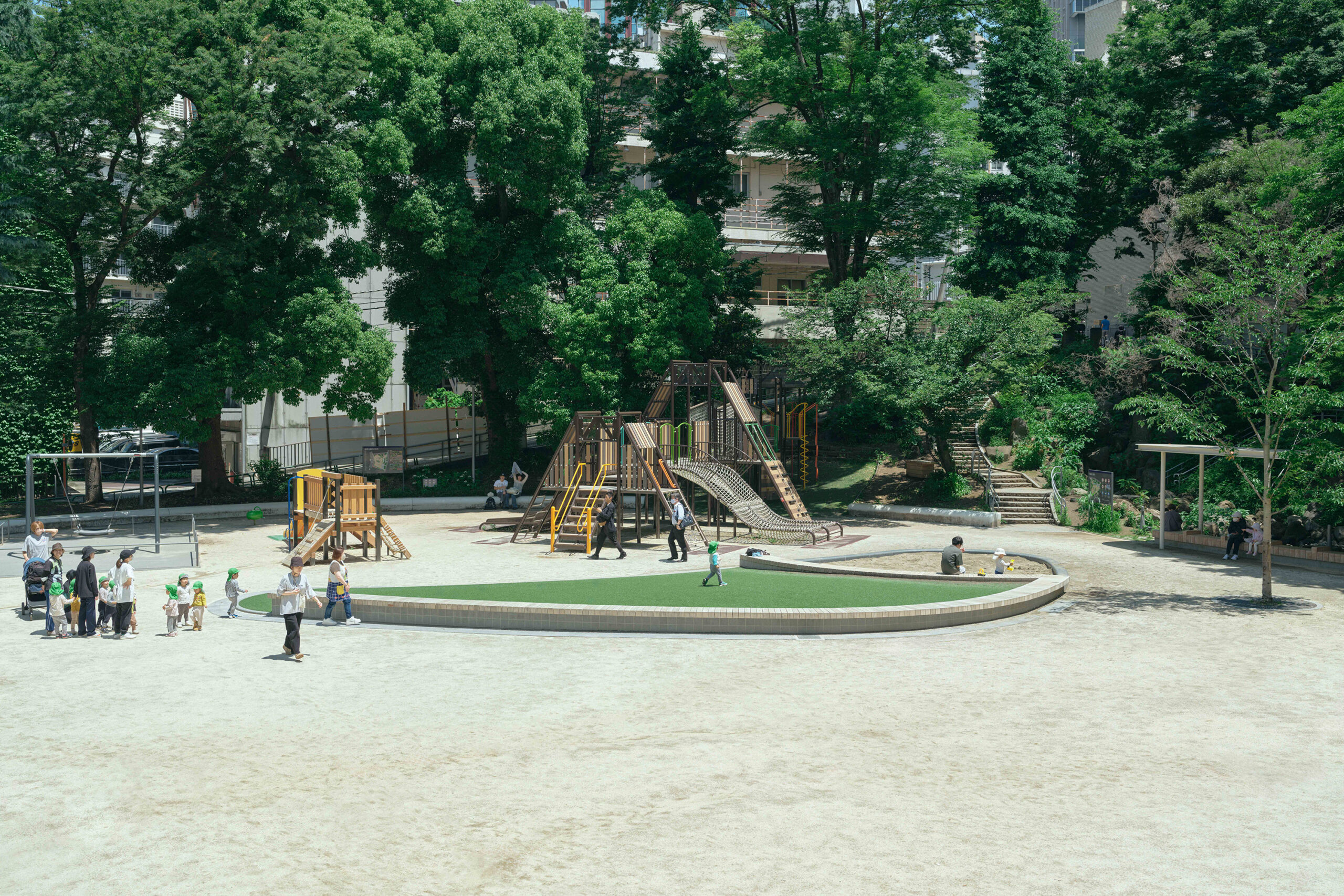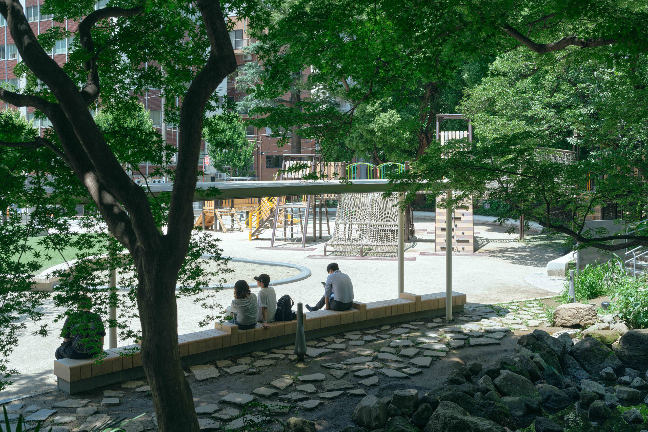 震災復興公園時からの地形、樹林、水路などを活かした、変化に富む都心の街区公園である。区の公園づくり基本方針の先行事例として、アンケートやオープンハウス、意見交換会など多様なチャネルで地元に意見を聞き、機能だけでなく配置や仕上げまで丁寧に設計に取り込まれている。隣接する幼稚園小学校側の出入口や境界部の高低差処理や歩道空間の確保など周囲との一体的な利用も計画されている。これらのプロセスにより、時間帯によって異なるさまざまな人に利用され、それぞれの過ごし方を許容する豊かな公共性が創造されている。